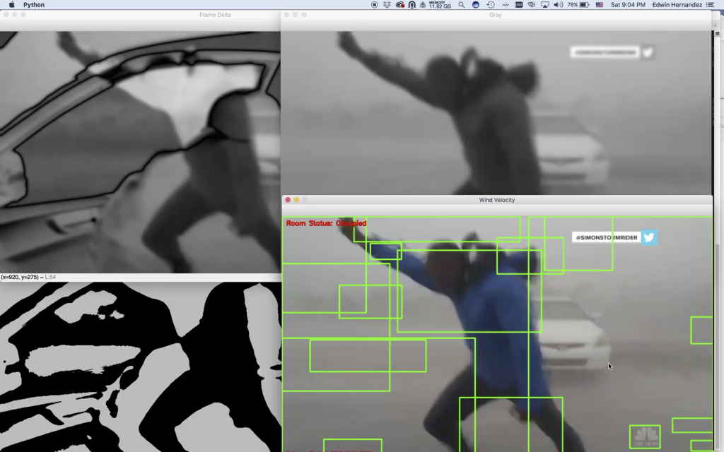In order to reviews this process, we need to replace a “velocity anemometer” (Augmented Realty Anemometer)  which could be mechanical or ultra-sound, for a video-powered anemometer, or even better an augmented reality device that basically augments the reality by providing the user a read on the hurricane or the wind speed.  For that, the main tool will be a server located locally in a computer that will be analyzing frame by frame of the images and creating a correlation function based on the number of squares that are computed after the threshold.