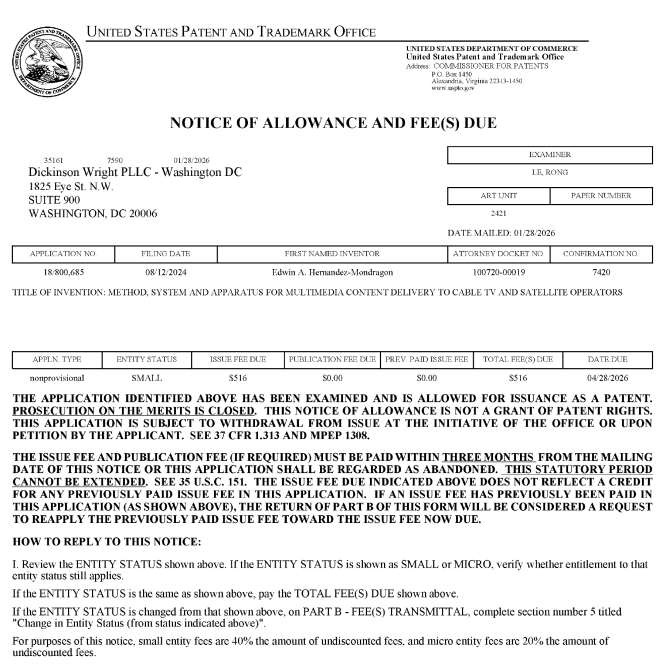 i just received a new “Notice of Allowance” for US20240406498A1 for what seems to be the 17th patent and the 5th in the Mevia Streaming Portfolio.  This patent comes to enhance the current portfolios of MEVIA and my streaming platforms, here I summarize as of January 31st, 2026 all portfolios owned and controlled by me.