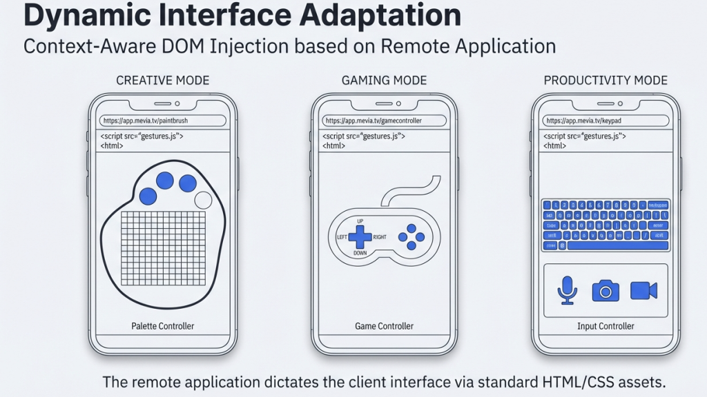 Your mobile device handles input, gestures, and processing, while the cloud delivers infinite scalability. One device powers infinite interfaces: gaming controller one moment, productivity dashboard the next, multimedia remote after that.