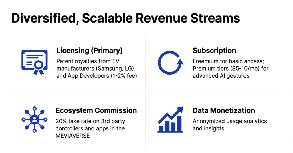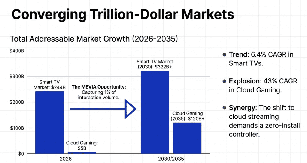 This creates a massive licensing opportunity with TV OEMs (Samsung, LG, TCL), cloud gaming providers, and enterprise signage networks — markets collectively worth hundreds of billions with minimal direct competition for a universal, patent-protected platform.