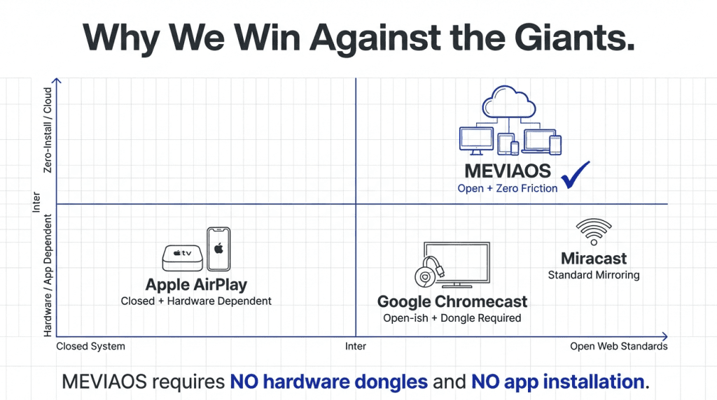 MEVIA OS differentiates through true decentralization, patented ultra-low-latency technology, and universal application across gaming, productivity, video conferencing, and digital signage.