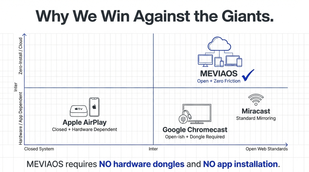 While competitors have validated demand in gaming, the broader “10-foot interface” across Smart TVs, hotels, stadiums, corporate displays, and emerging spatial computing remains largely unaddressed. No existing solution offers MEVIA OS’s combination of instant access, decentralization, and extensibility to any web-based experience.